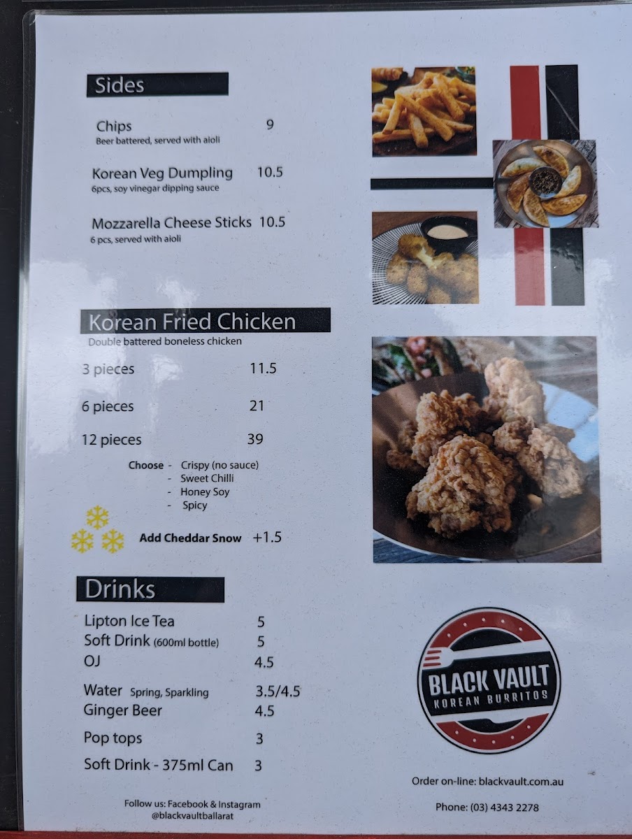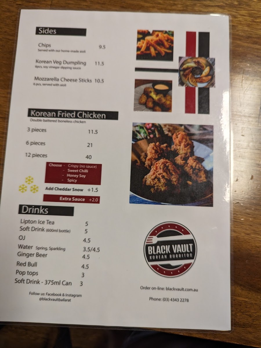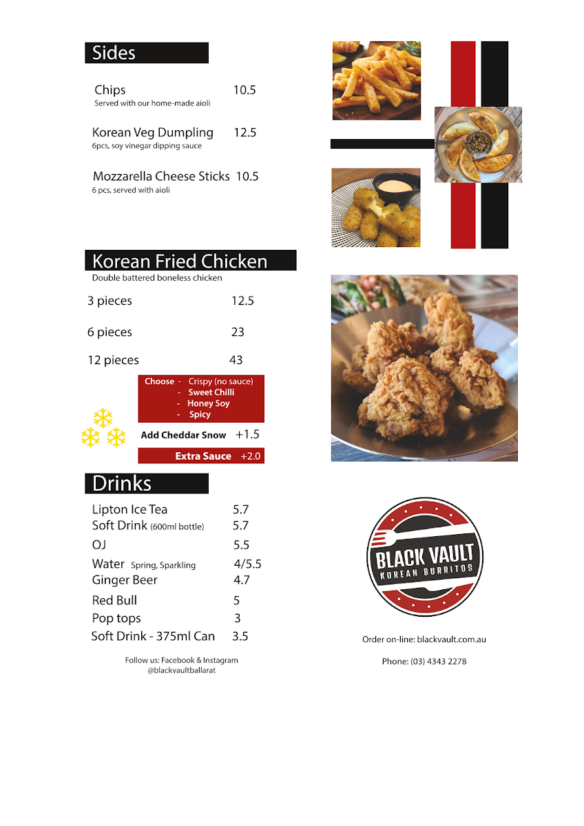 Overall, Black Vault's menu provides an exciting fusion of flavors, from crispy fried delights to hearty burritos and bibimbaps, ensuring that there's something to satisfy every craving. Whether you're in the mood for something spicy, cheesy, or simply comforting, the diverse range of options makes this restaurant an excellent choice for a satisfying meal.