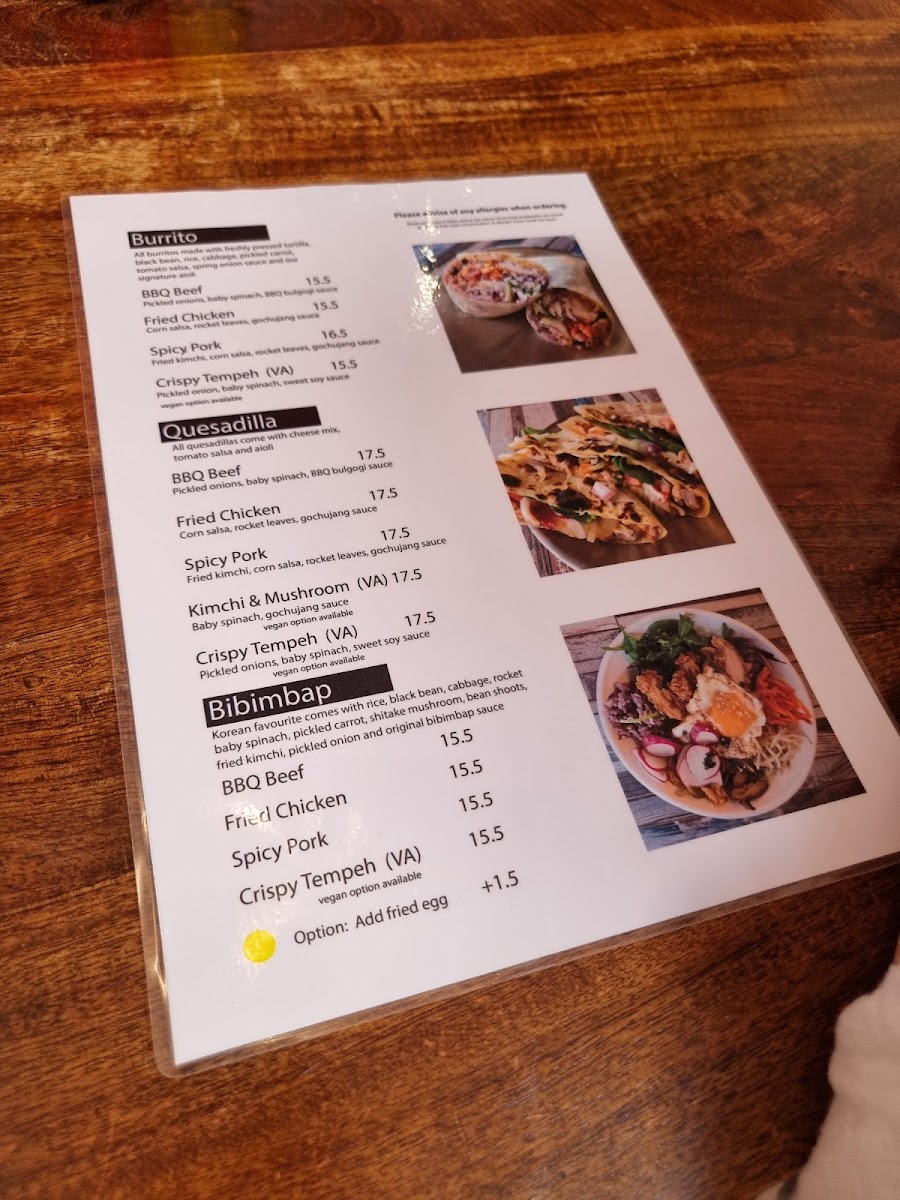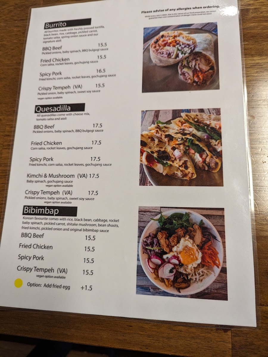 Burritos made with lightly grilled tortilla, black bean, rice, cabbage, pickled carrot, tomato salsa, spring onion sauce, fried shallots, Korean BBQ beef, pickled onion, baby spinach and BBQ bulgogi sauce.