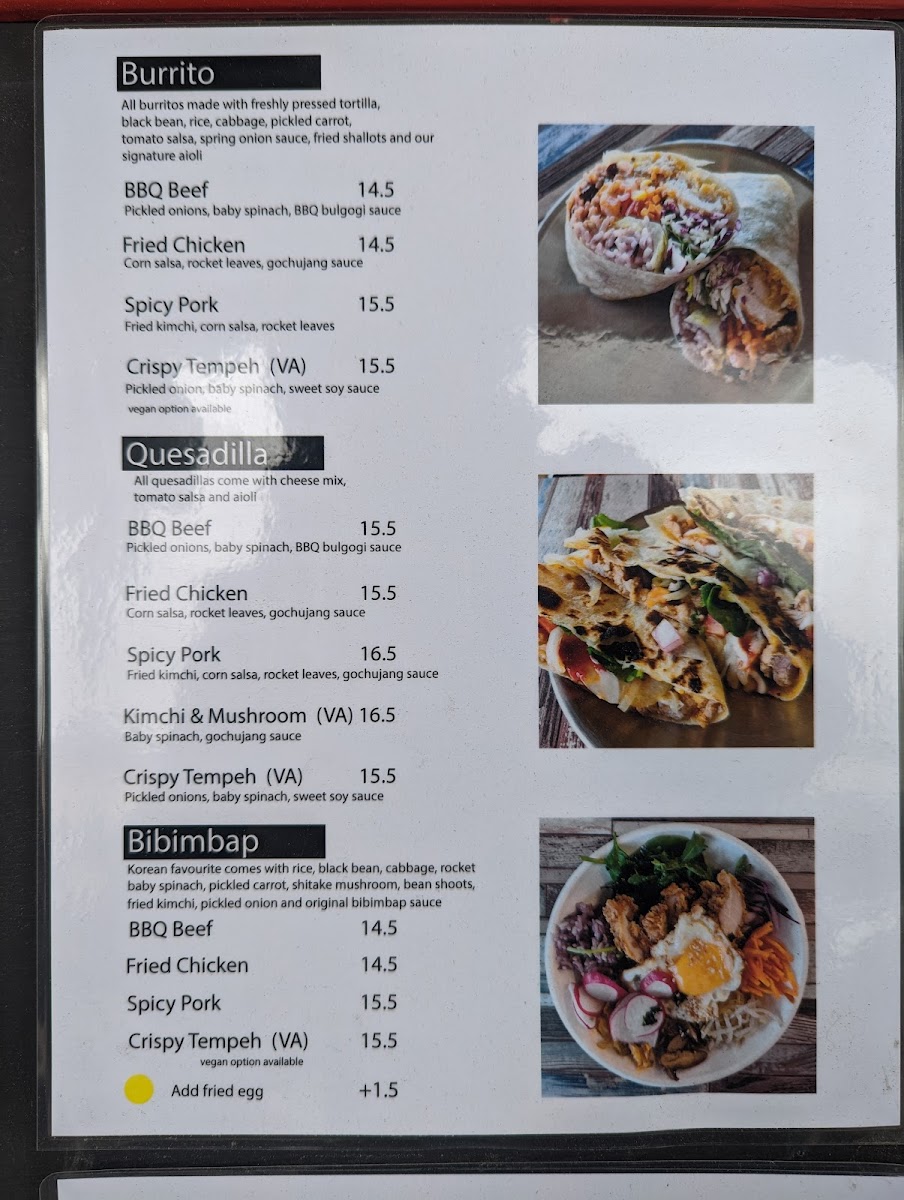 Burritos made with lightly grilled tortilla, black bean, rice, cabbage, pickled carrot, tomato salsa, spring onion sauce, tomato sauce, aioli, corn salsa, rocket leaves and gochujang sauce.